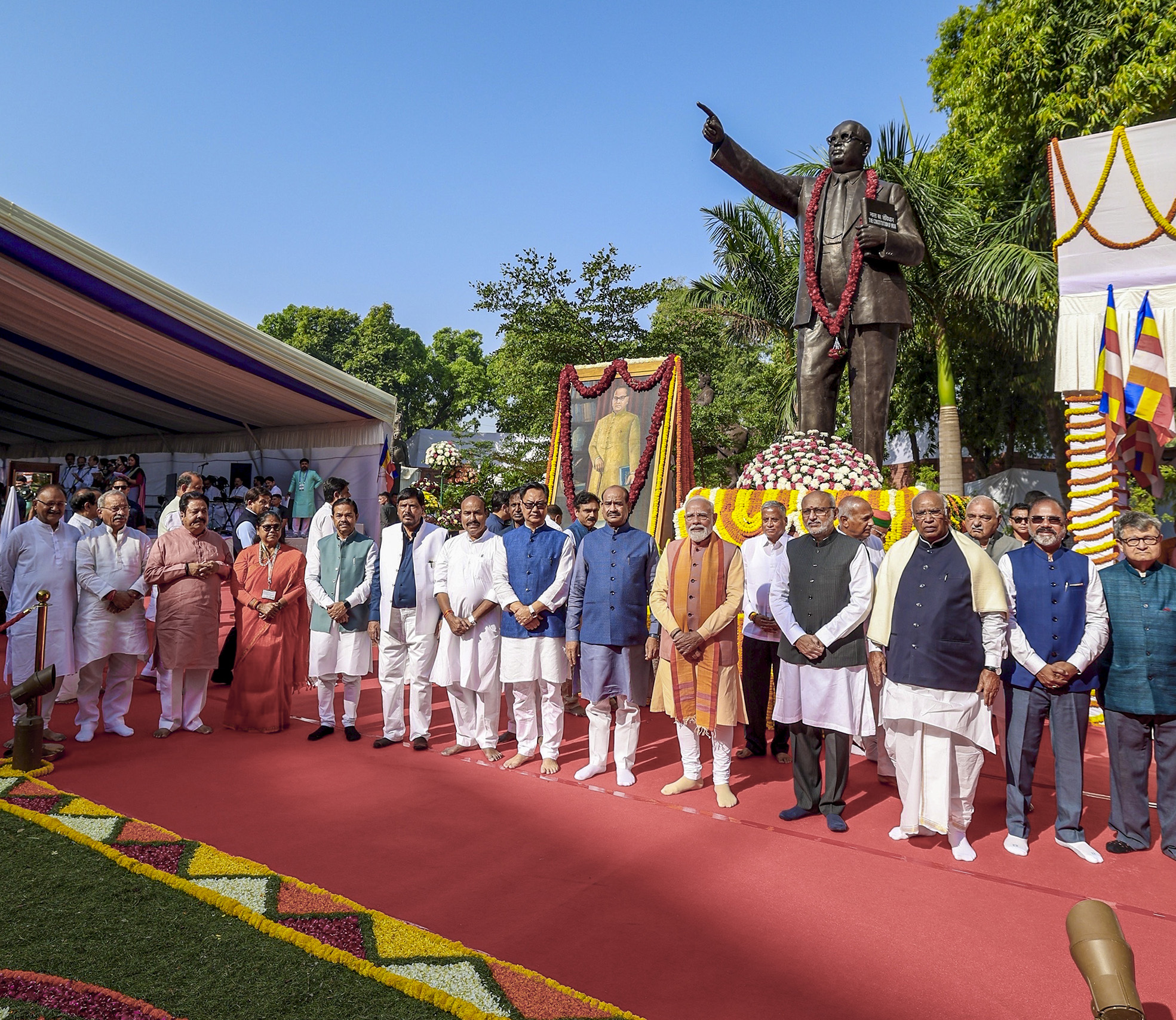 Vice President Radhakrishnan, who is also the Rajya Sabha Chair, PM Modi, Speaker Birla, Congress president Mallikarjun Kharge offered flowers at the portrait and statue of Ambedkar.