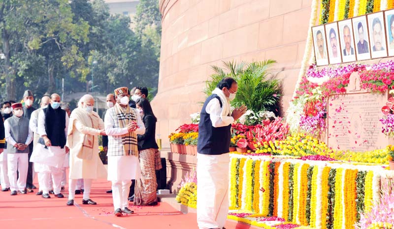 Vice President and Rajya Sabha Chairperson M Venkaiah Naidu, Prime Minister Narendra Modi, Speaker Om Birla, Union ministers and Opposition leaders on Sunday paid tributes at the Parliament complex to those who lost their lives in the 2001 Parliament attack.