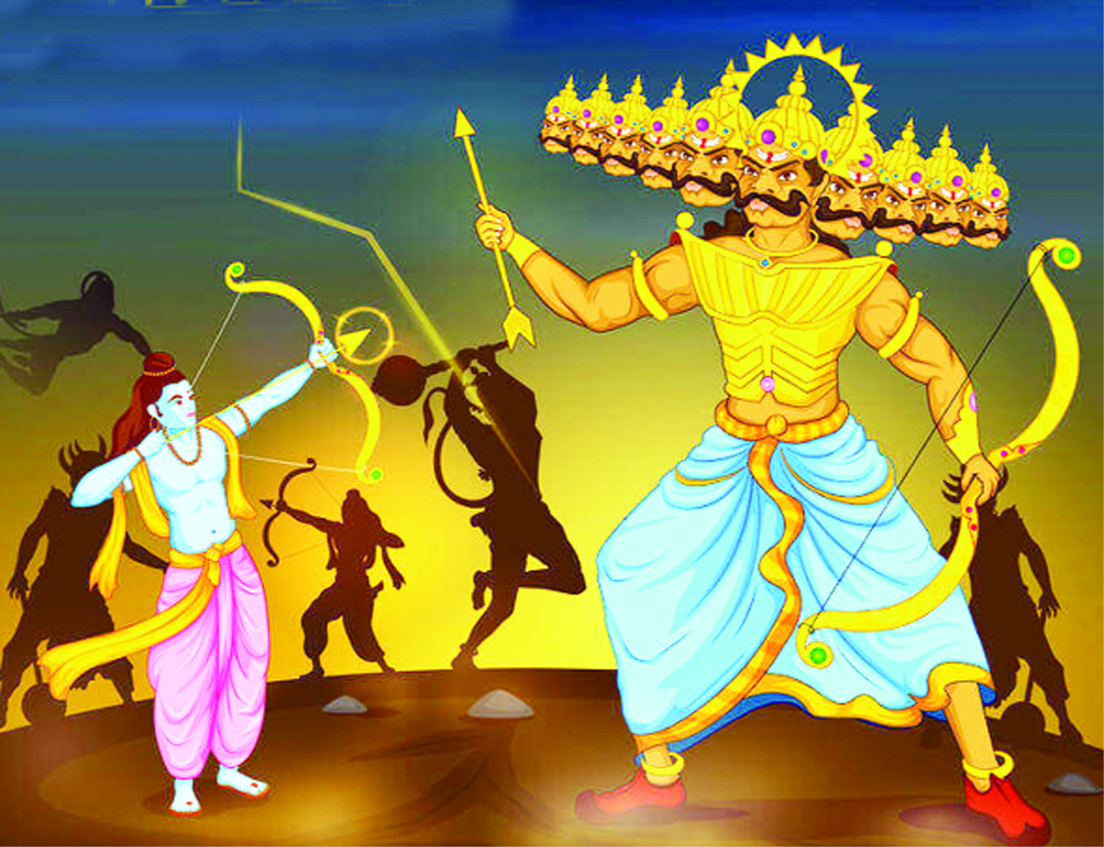 Thousands of casualties occurred on both sides. Kumbhkarna was killed by Rama in the first phase of battle was also killed by Lakshmana. After the killing of his son, a fierce battle took place between Rama and Ravana. Ravana let loose his illusive power and killed many monkeys of Rama’s Army. It appeared as if the war was going in favour of Ravana. At last Vabhishna disclosed to Rama that nectar abides deep in Ravana’s navel. Because of this he has been surviving time and again.
