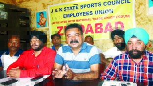 Vikramjeet Singh, president J&KSSCEU and Rajinder Kumar, vice president J&KNTUF addressing media persons in Jammu on Sunday. By Daily Excelsior - July 26, 2015 Share FacebookTwitterWhatsAppPinterestLinkedinCopy URLTelegramEmailTumblrReddItPrintKoo Vikramjeet Singh, president J&KSSCEU and Rajinder Kumar, vice president J&KNTUF addressing media persons in Jammu on Sunday. Vikramjeet Singh, president J&KSSCEU and Rajinder Kumar, vice president J&KNTUF addressing media persons in Jammu on Sunday. Follow our WhatsApp channel