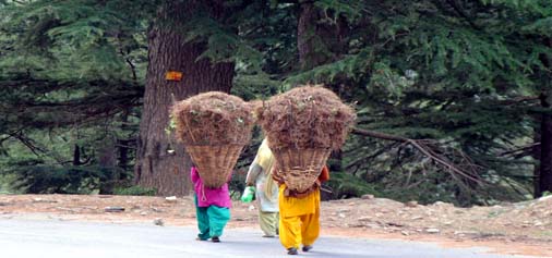 Village women carrying luggage of dry Pine leaves on their back collected from forest in mountainous Doda district on Sunday.(UNI)
