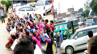 Villagers and students staging dharna on Dhar road. By Daily Excelsior - July 25, 2017 Share FacebookTwitterWhatsAppPinterestLinkedinCopy URLTelegramEmailTumblrReddItPrintKoo Villagers and students staging dharna on Dhar road. Villagers and students staging dharna on Dhar road. Follow our WhatsApp channel
