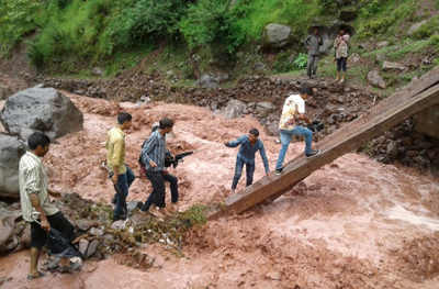 UDHAMPUR, July 31: In absence of a foot bridge, locals of village Saddal in Panjar tehsil and adjoining areas risk their lives to cross the Saddal river.