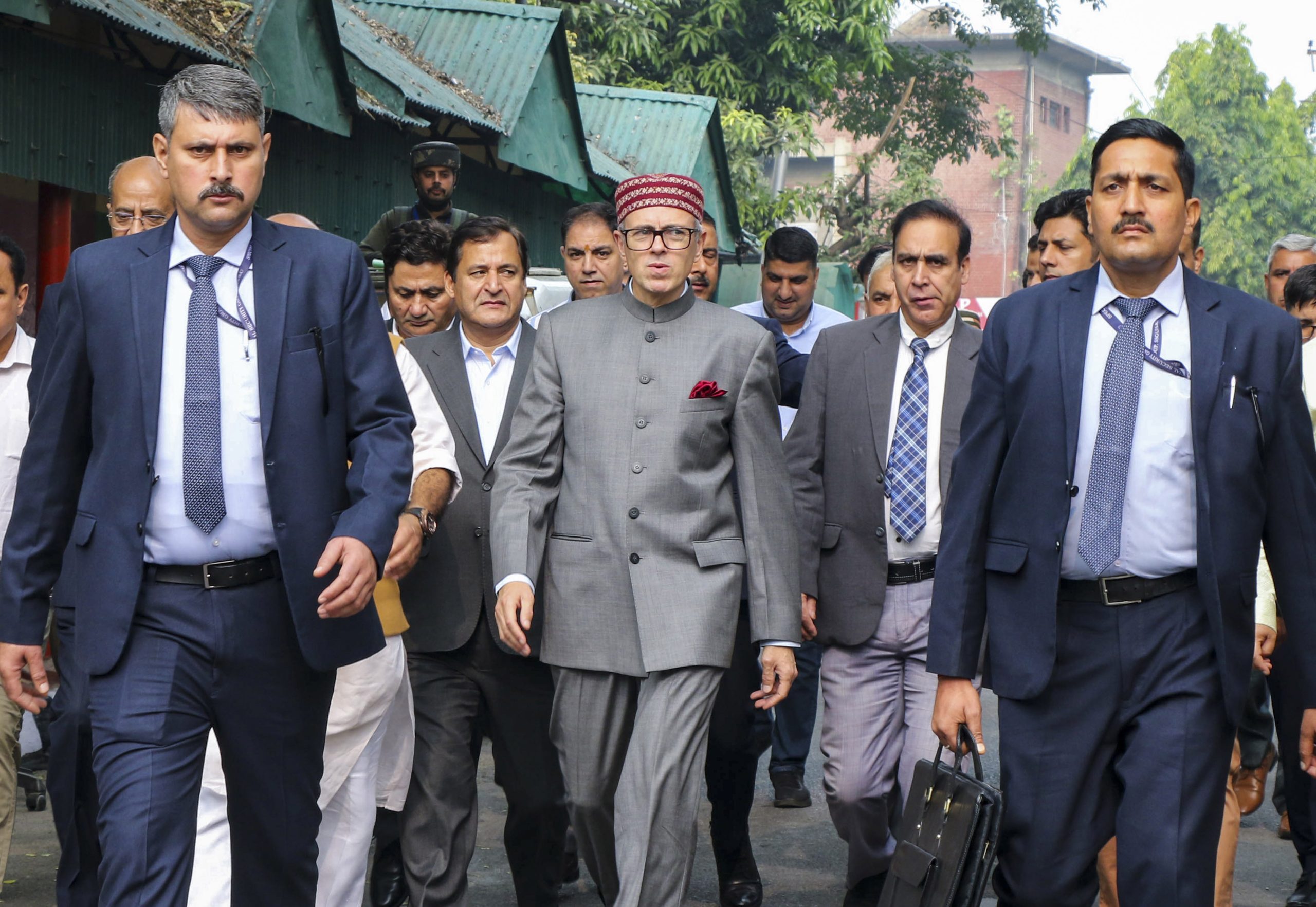 Jammu and Kashmir Chief Minister Omar Abdullah and Deputy CM Surinder Choudhary arrive for a visit to the Civil Secretariat, in Jammu