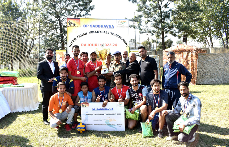 RAJOURI, Oct 29: Indian Army organized Inter Tehsil Volleyball Tournament at ALG, Rajouri and concluded here today. The teams from eight Tehsils, Darhal, Manjakot, Thanamandi, Rajouri, Kalakote, Naushera, Kotranka and Budhal participated in this tournament.