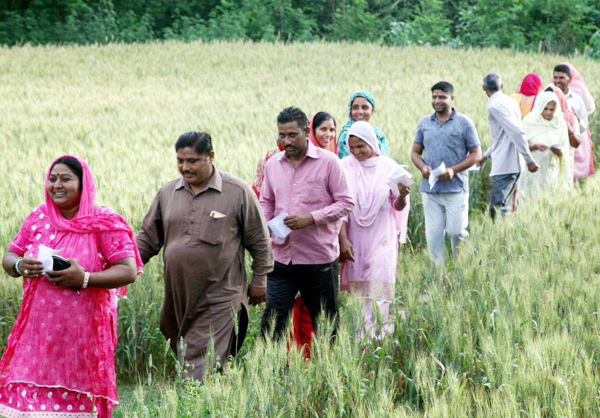 Farmers passing through wheat fields to cast their votes at a polling station in village Mawa Karora near Akhnoor town in Jammu district. -Excelsior/Rakesh