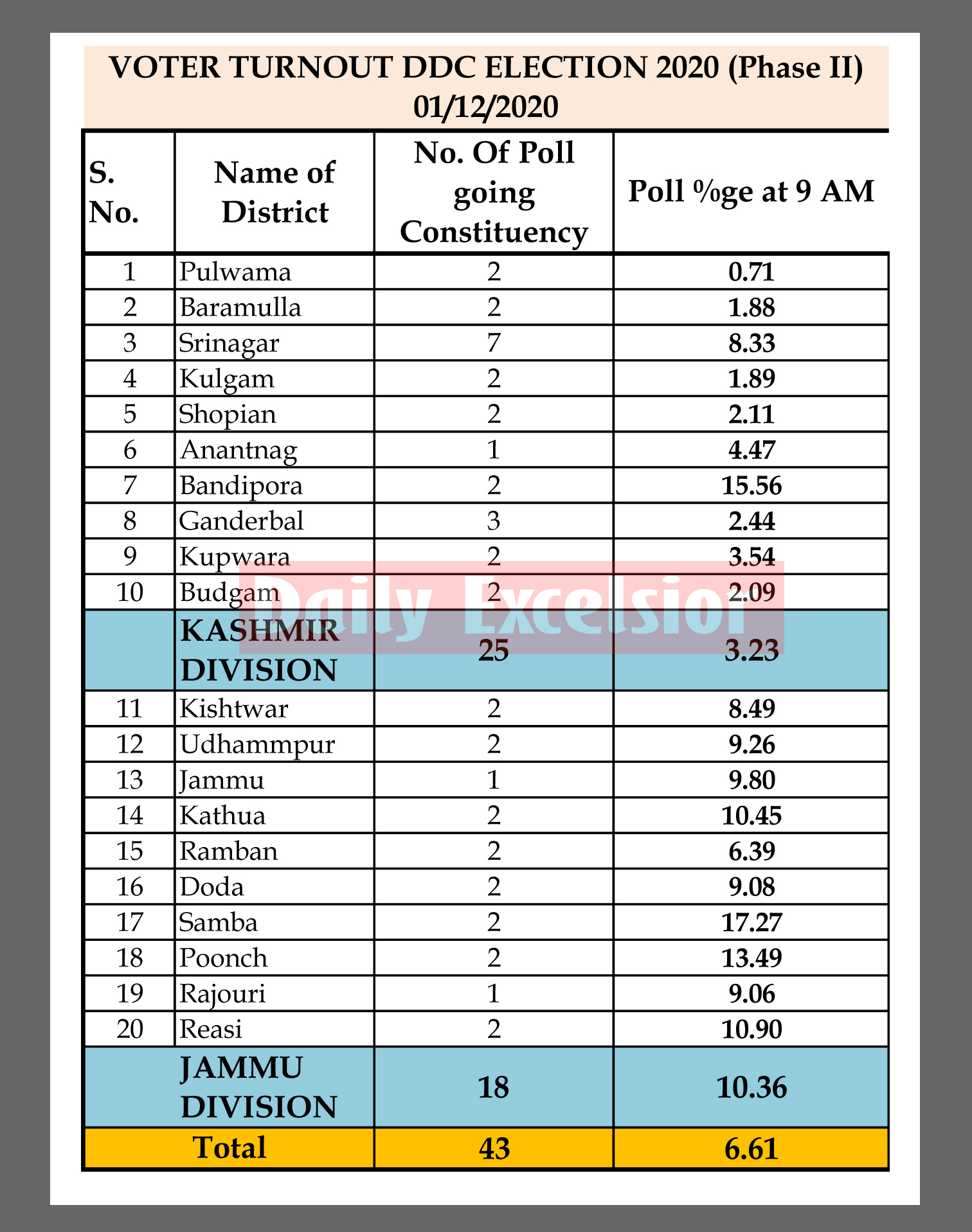 Kashmir division has polling percentage of 3.23% and Jammu division has 10.36% voter turnout. Overall, 6.61% voters have casted their votes upto 9 am.