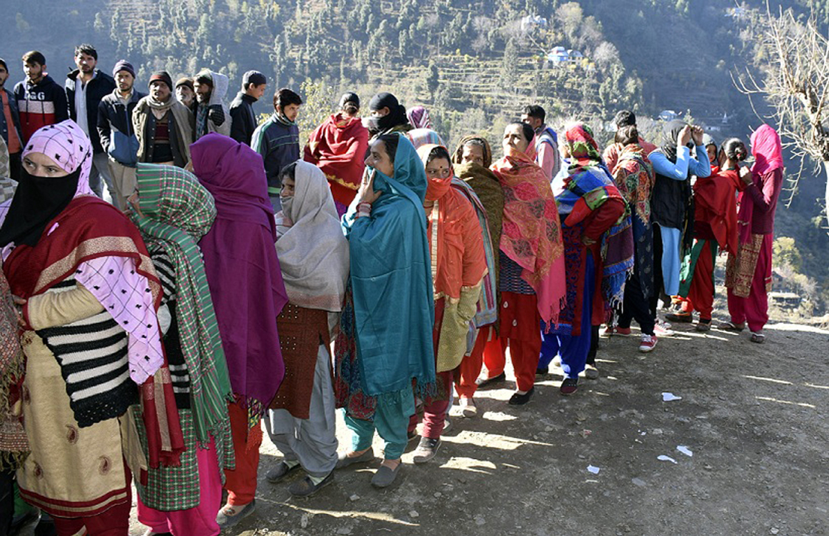 Voters wait for their turn outside a polling station in Ramban on Saturday. -Excelsior/Parvez Mir