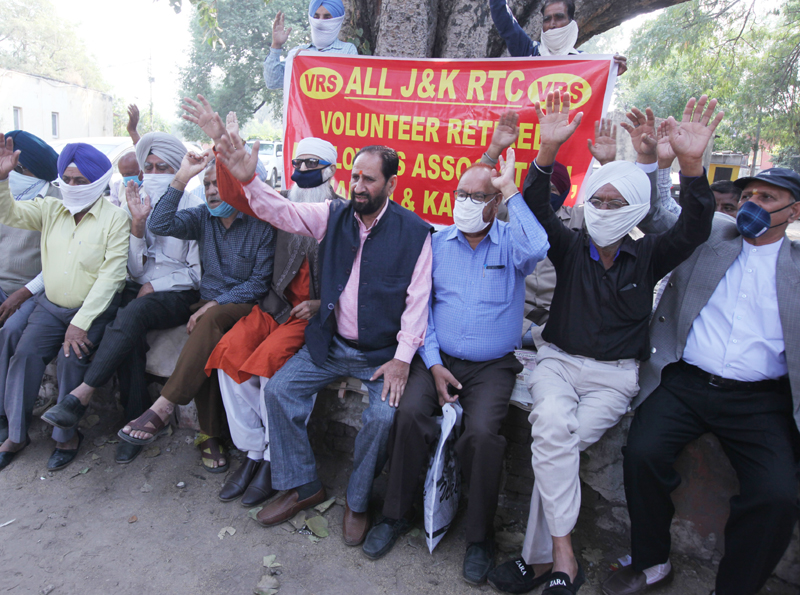 VREA members raising slogans during protest at Jammu on Monday. —Excelsior/Rakesh
