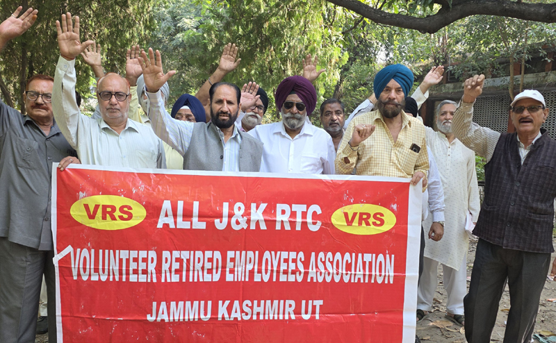 JAMMU, Nov 3: Volunteer Retired Employees (VRS/GHS) of the J&K State Road Transport Corporation (SRTC) today staged a demonstration and sit-in near Press Club Jammu under the leadership of Dev Raj Bali, president of the VRS Union Jammu, demanding immediate settlement of their long-pending dues and pensionary benefits.
