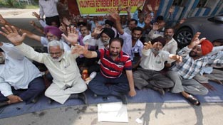 VRS employees raising slogans during protest at Jammu on Wednesday. -Excelsior/Rakesh