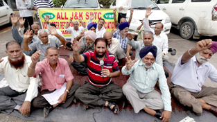 JAMMU, July 13: Voluntarily retired employees of J&K State Road Transport Corporation (JKSRTC) today held protest demonstration and dharna in support of their demands at Exhibition Ground, near Press Club here today.