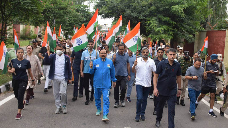 The walkathon under ‘Har Ghar Tiranga’ started from Gulshan Ground Jammu and culminated at Maharaja Hari Singh Park via Jammu University. Carrying the national flag, they raised ‘Bharat Mata ki Jai’ slogans throughout the 3 km-long stretch.
