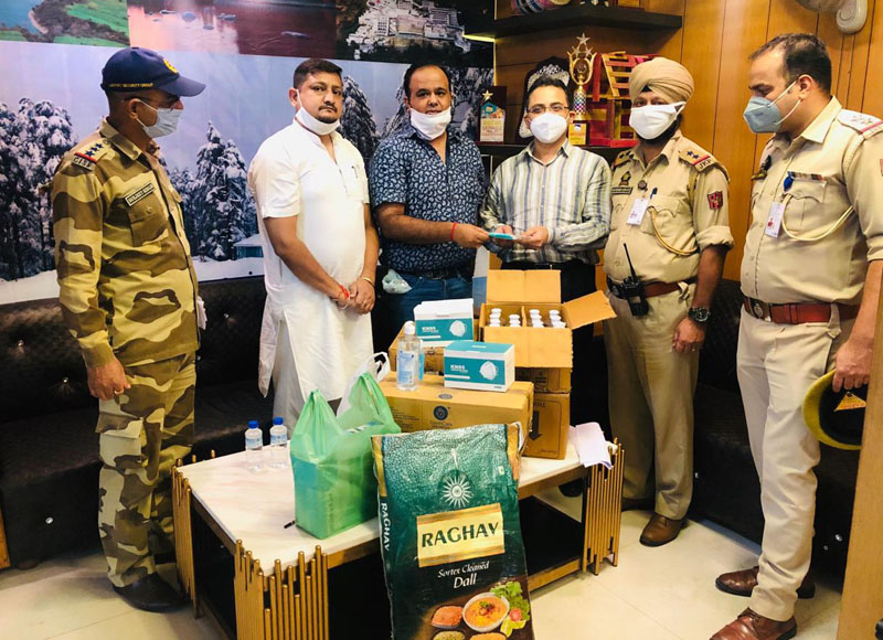 JAMMU, Aug 19: Traders Federation Ware House-Nehru Market Jammu donated 160 N-95 masks, 200 sanitizers and 200 gloves to Kapil Sharma, Nodal Officer Jammu Airport. Deepak Gupta, general secretary of Federation along with Rajiv Gupta handed over the above items to Kapil Sharma in presence of Anil Kumar, Junior KAS officer, Surjeet Singh, Administrative Officer CISF and Rajeshwar Singh, SI JKP.