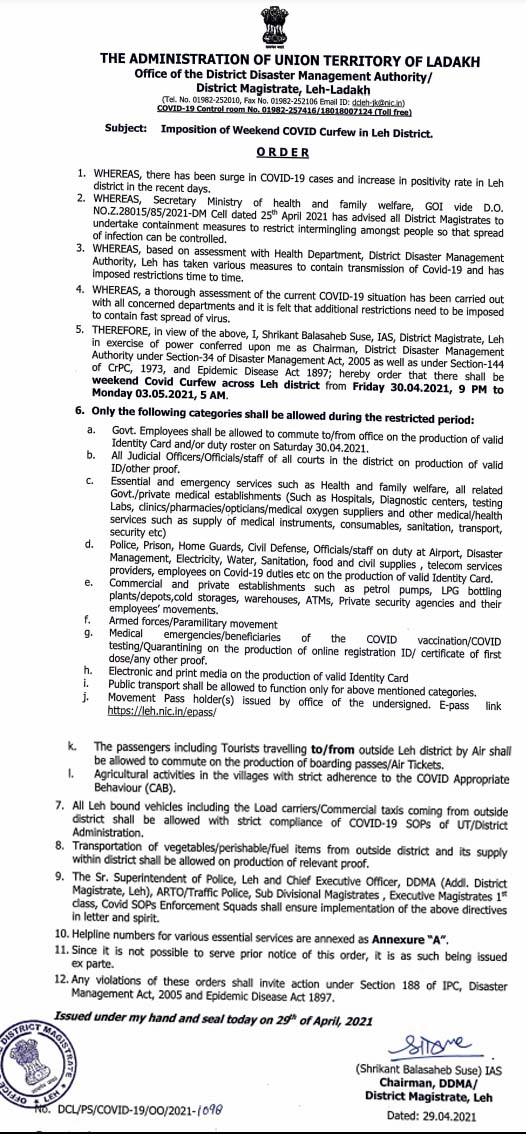 DDMA chairman and Deputy Commissioner Leh Shrikant Suse, notified the imposition of the weekend COVID-19 curfew from 9 pm on Friday to 5 am on Monday, as an additional restriction in an attempt to curb the spread of the infection.