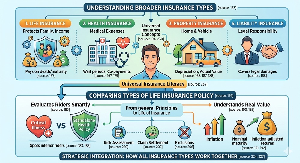 Health insurance knowledge improves life insurance rider evaluation. Vehicle insurance teaches premium logic and claims. Property insurance helps with inflation thinking.