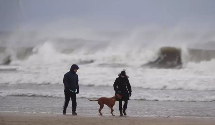 People were urged to stay away from the coast in Scarborough, in northeast England, as a combination of winds and a high tide were expected to pound the shore with large waves.