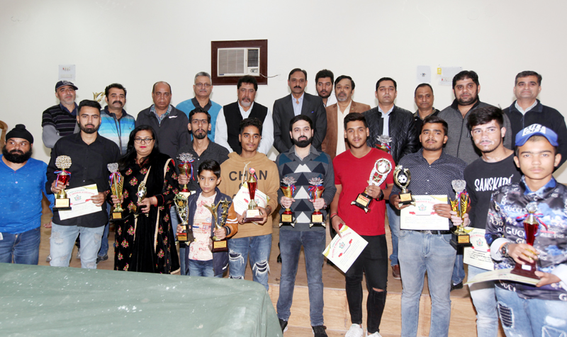 Winner and runner-up position holders of 27th Sub Junior, Junior and Senior Billiards and Snooker Championship posing for group photograph with Vishal Sharma, Assistant Solicitor General of India in J&K High Court Jammu Wing and office bearers of Jammu and Kashmir Billiards and Snooker Association at MA Stadium, Jammu on Wednesday. -Excelsior/Rakesh