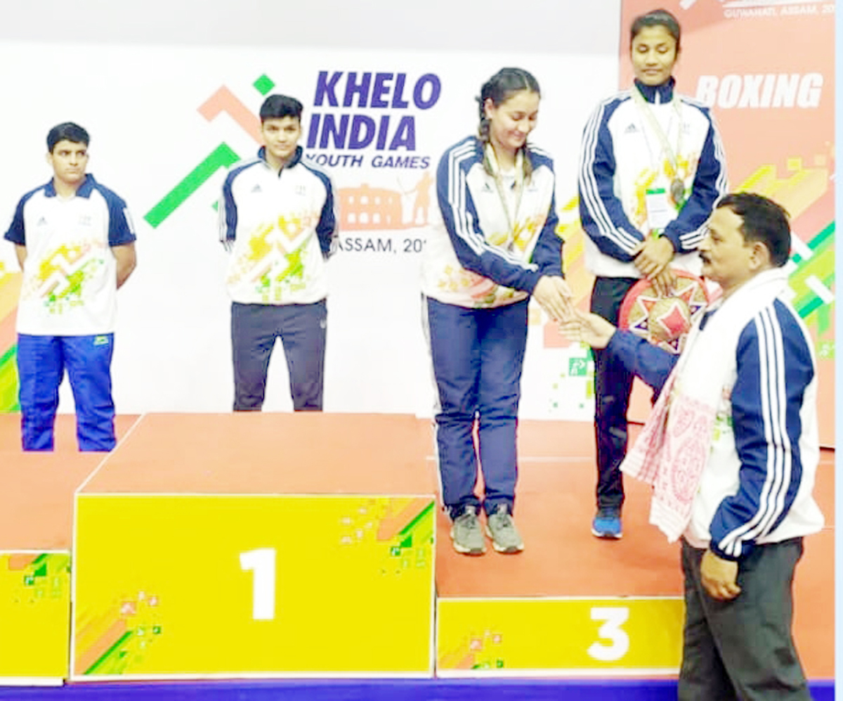 Winner of Boxing competition along with Farhana Eliyas posing for a group photograph in 3rd Khelo India Youth Games, 2020 held recently at Guwahati.