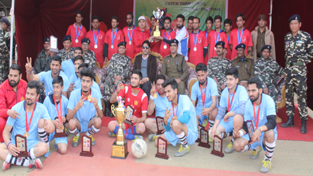 Winner of Football Tournament posing for a group photograph alongwith prizes during concluding ceremony of Football Tournament in Ramban.