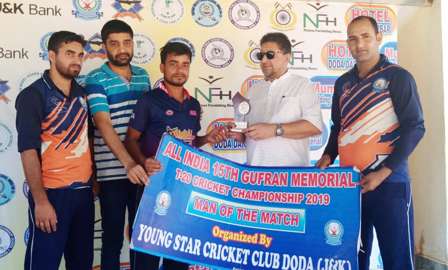 Winner receiving man of the match award at Sports Stadium in Doda.