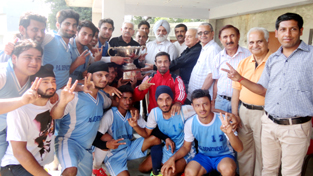 Winner team of Inter-College Football (Men) Tournament, alongwith trophy posing for a group photograph with JU VC, Prof Mohan Pal Singh Ishar and other dignitaries at Jammu.