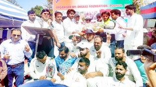Winners of Ehsaas Cup T20 Cricket Tournament posing for a group photograph along with dignitaries after lifting the title in Poonch.