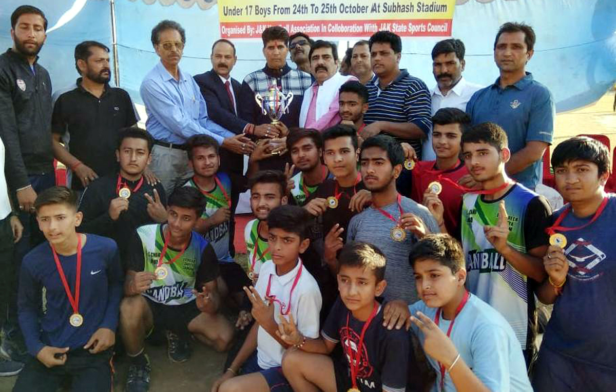 Winners of Handball Championship under Khelo India posing along with dignitaries and officials at Subash Stadium in Udhampur.