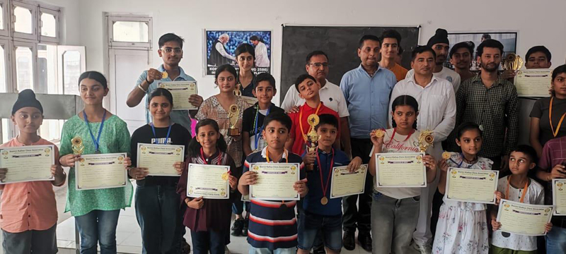 Winners in various categories of Kathua District Chess Championship posing with dignitaries.