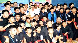 Winners of 5th Thang-Ta Federation Cup posing for photograph with Speaker Kavinder Gupta and others at Jammu on Tuesday. —Excelsior/Rakesh
