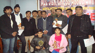 Winners of Chess Championship posing alongwith the chief guest and other dignitaries in Jammu on Monday.