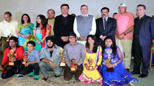 Winners of ‘Choona Hai Aasman Season III’ posing for photograph with Chief Minister Omar Abdullah, Union Minister Dr Farooq Abdullah and Music Composer Anu Malik at SKICC, Srinagar.