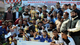 Winners of Football Tournament organised by SSB posing for a group photograph in Jammu on Thursday. -Excelsior/Rakesh