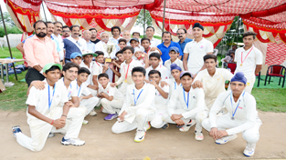 Winners of Hot Weather Cricket Tournament posing along with chief guest Ajay Sadhotra and other dignitaries in Jammu on Sunday.