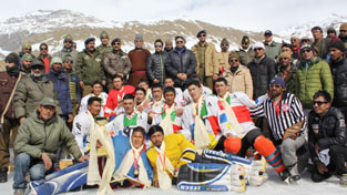 Winners of Ice Hockey Cup posing alongwith dignitaries at Shotopa in Kargil on Sunday.
