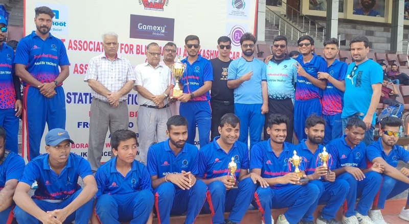 Winners of Inter-State Cricket Tournament for blind receiving trophy from chief guest at MA Stadium in Jammu.