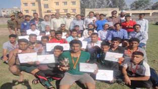 Winners of Wrestling Championship displaying certificates while posing for a group photograph at Bari Brahmana Stadium on Saturday.
