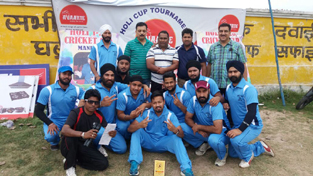 Winners posing along with organizers and officials at Mandal cricket ground in Jammu on Sunday.