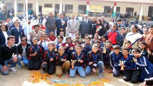 Winners posing alongwith the dignitaries during concluding ceremony of 60th National School Games in Jammu. -Excelsior/Rakesh