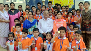 Winners of various events posing for a group photograph while celebrating National Sports Day at Sprawling Buds School in Jammu.