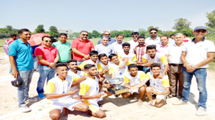 Winning team of Inter-Collegiate Kho-Kho Tournament posing along with dignitaries and officials in Jammu.