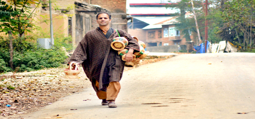 Winter is here: A man carries ‘Kangris’ to his house to keep the family warm at Achabal in Anantnag on Thursday. -Excelsior/Sajad Dar