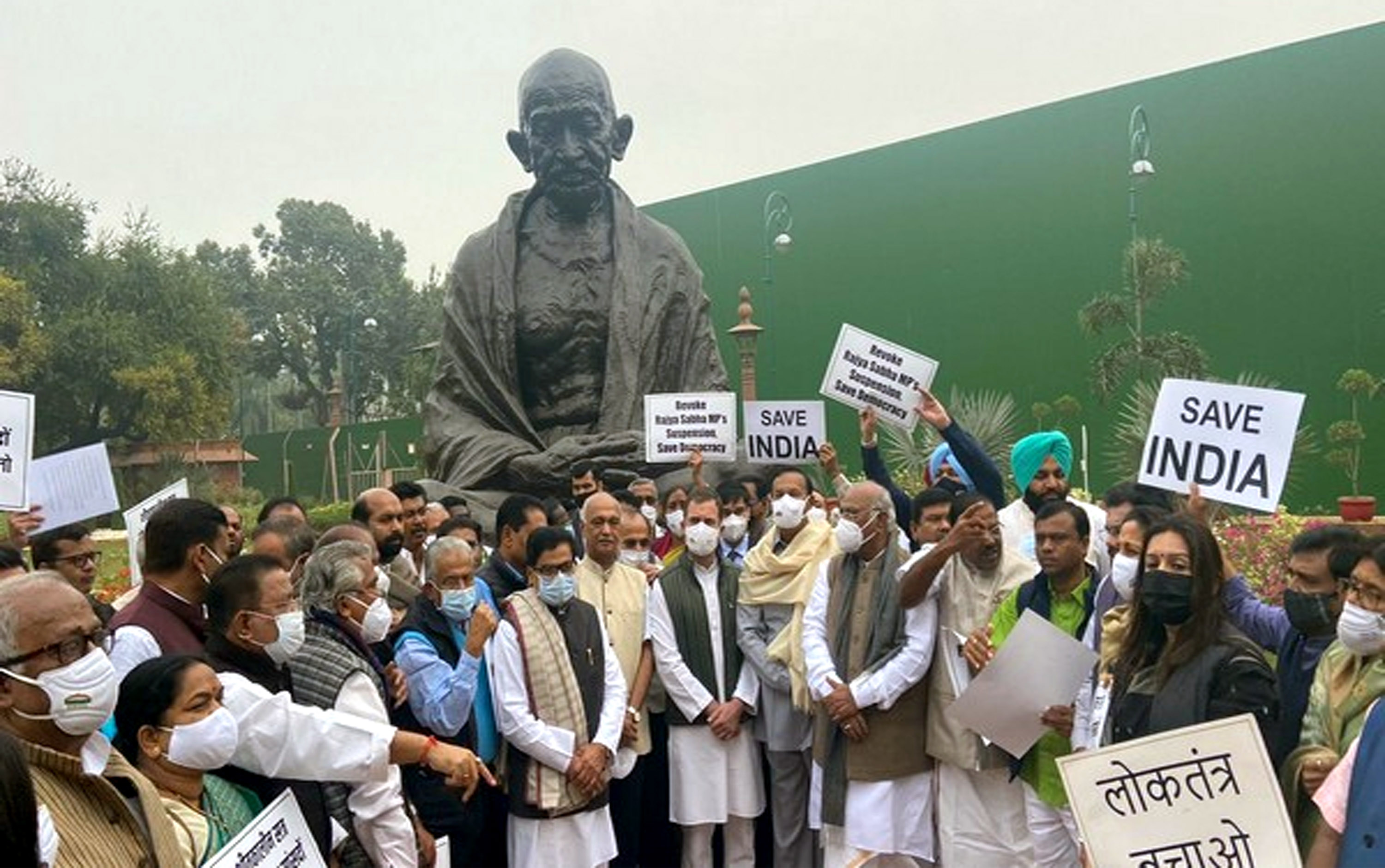 New Delhi, Dec 1: Opposition party leaders including Congress MP Rahul Gandhi staged a protest at the Gandhi statue inside Parliament premises on Wednesday demanding revocation of suspension of 12 Rajya Sabha members.