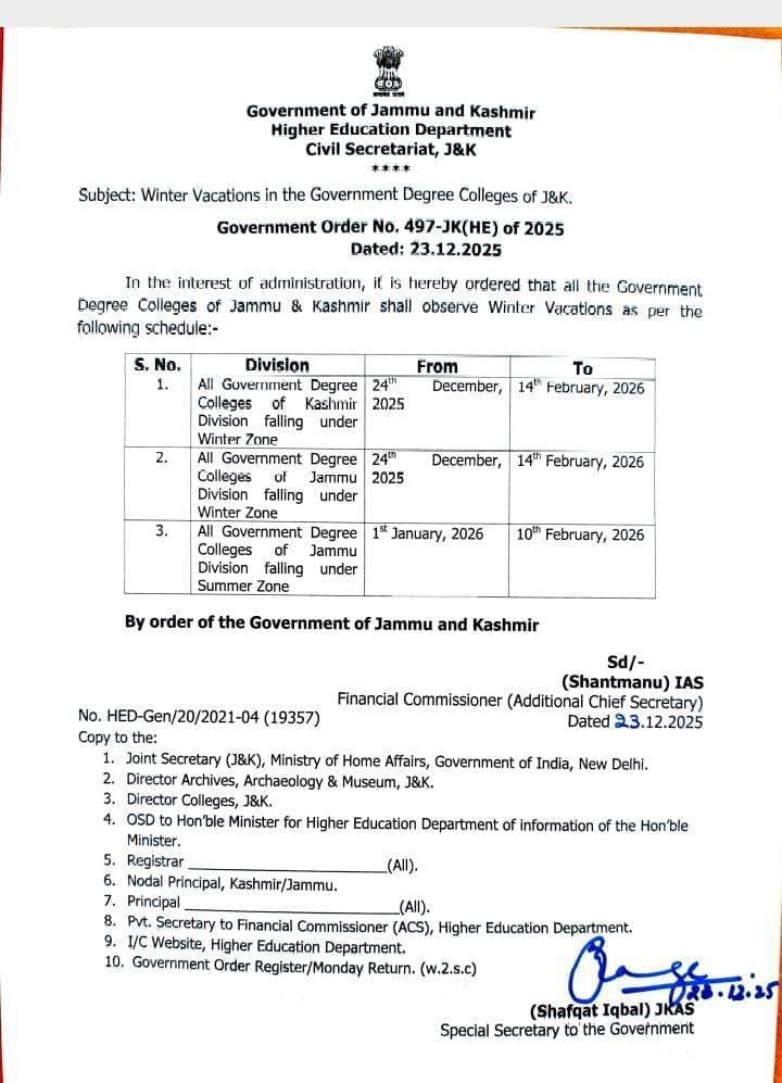 As per an order issued by the Higher Education Department, Government Degree Colleges falling under the Winter Zone in both Kashmir Division and Jammu Division will observe winter vacations from December 24, 2025, to February 14, 2026.
