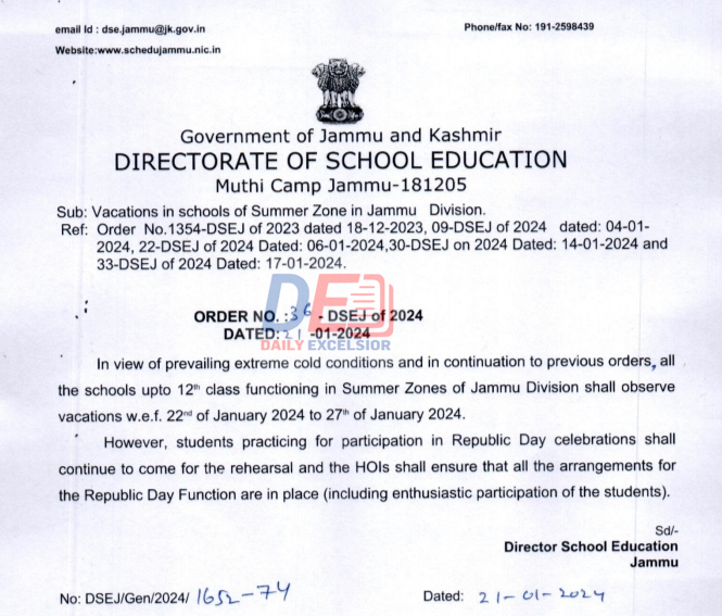 DSEJ in a order said, “In view of prevailing extreme cold conditions and in continuation to previous orders, all the schools upto 12th class functioning in summer zones of Jammu division shall observe vacations from January-22 to January-27-2024.”