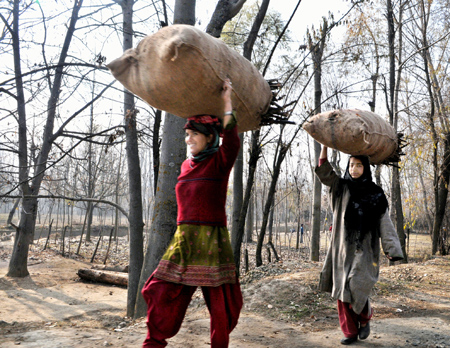 Women carry dry leaves on their heads at village Sangrama in Sopore area of Baramulla district on Tuesday. -Excelsior/Amin War