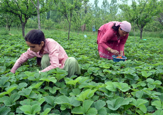 Women collecting strawberries inside their farm at Habak Hazratbal on the outskirts of Srinagar on Saturday. —Excelsior/Amin War