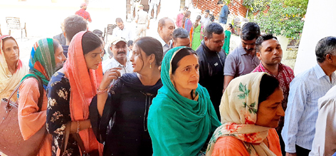 Women Sarpanchs and Panchs queue up to cast votes in Udhampur district on Thursday. — Excelsior/ K Kumar