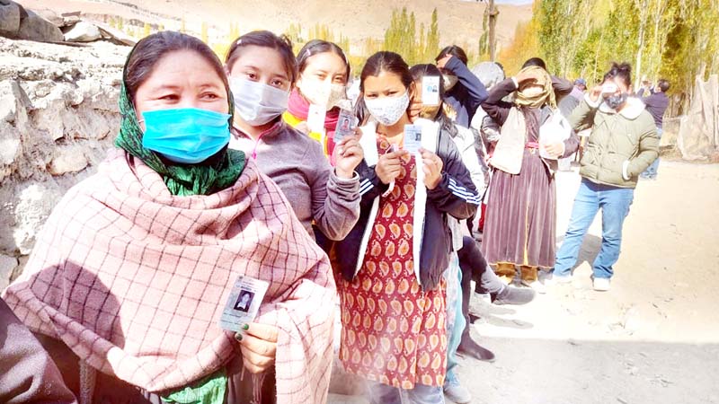 Women voters in a queue in front of a polling booth in Leh on Thursday. -Excelsior/Morup Stanzin
