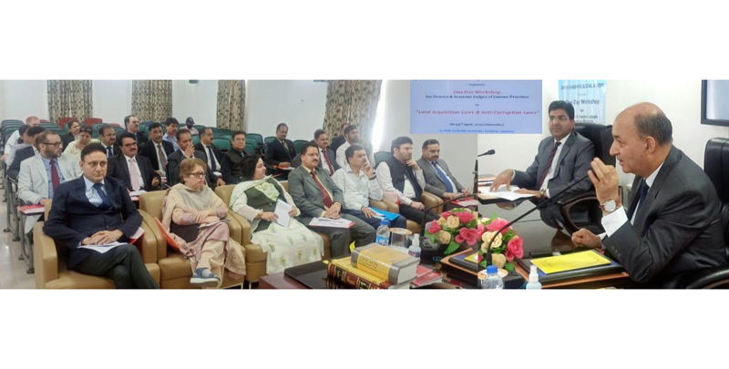 JAMMU, Apr 23: J&K Judicial Academy under the patronage of Justice Pankaj Mithal, Chief Justice, High Court of Jammu & Kashmir and Ladakh, (Patron-in-Chief, J&K Judicial Academy) and guidance of Justice Dhiraj Singh Thakur, Chairman, Governing Committee for J&K Judicial Academy and Justice Sindhu Sharma and Justice Javed Iqbal Wani; Members of Governing Committee for J&K Judicial Academy, organized one day workshop for District and Sessions Judges of Jammu Province including those on deputation on “Land Acquisition Laws and Anti-Corruption Laws” at Judicial Academy, here.
